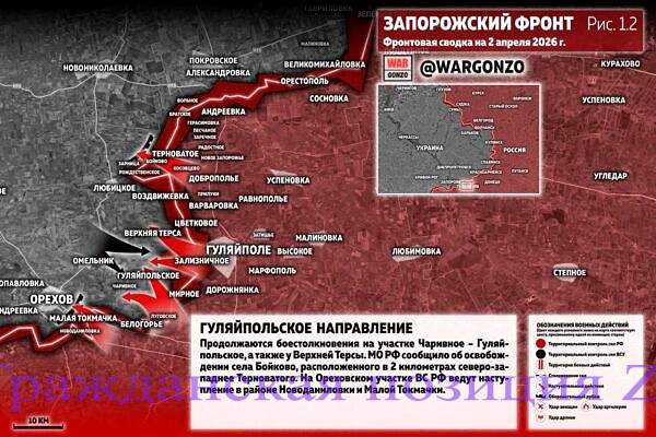 На 2 апреля 2026г Сводка от WarGonzo на 3 апреля 20 26 года. ⚡️Фронтовая сводка на утро 02.04.26⚡️ Запорожский фронт ВС РФ удерживают занятые позиции в Степногорске и Приморском, идут бои. На левом фланге Ореховского направления идут бои в районе Малых Щербаков. (Рис. 1.1) На Гуляйпольском направлении продолжаются боестолкновения на участке Чаривное – Гуляйпольское, а…